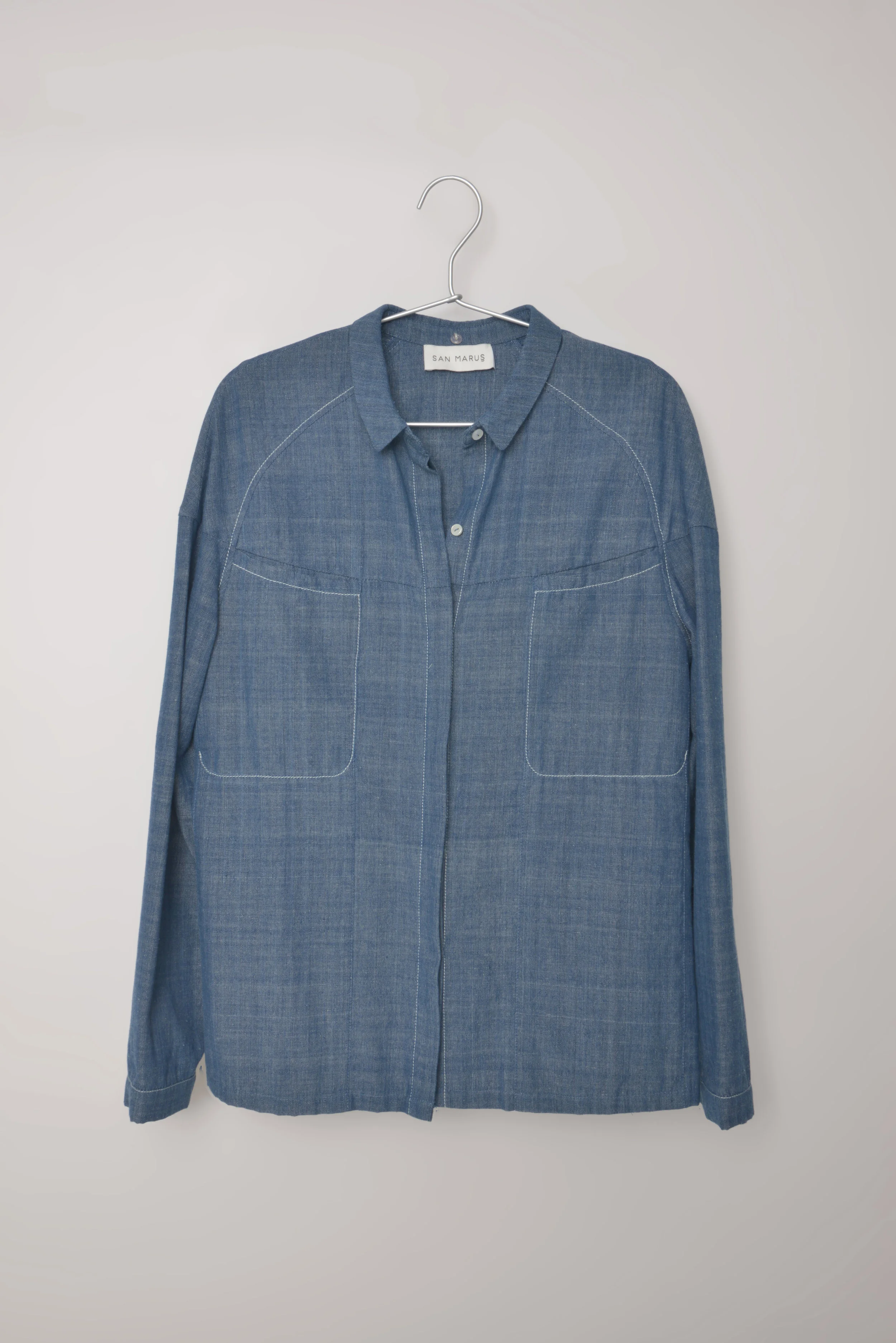 Handwoven cotton, hand-dyed with natural dyes in Bali. Lightweight chambray cotton with a beautiful texture. Sustainably sourced mother-of-pearl buttons from Italy. Rich blue cotton with contrast nude top stitching, emphasises the modern cut.